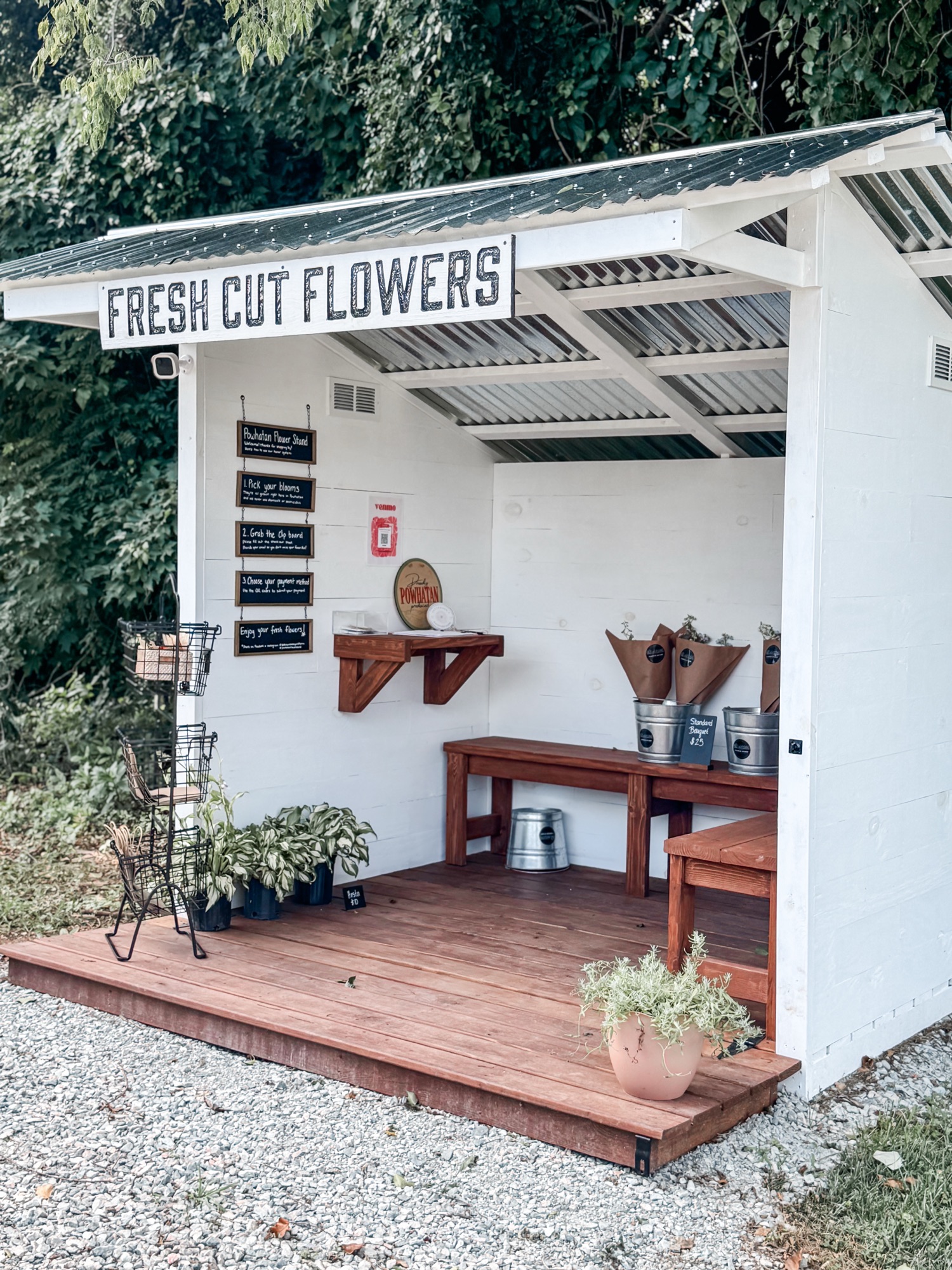 This delightful outdoor flower stand is not any ole flower stand, but a sanctuary of color and fragrance, showcasing an array of seasonal blooms and unique floral arrangements, locally grown.