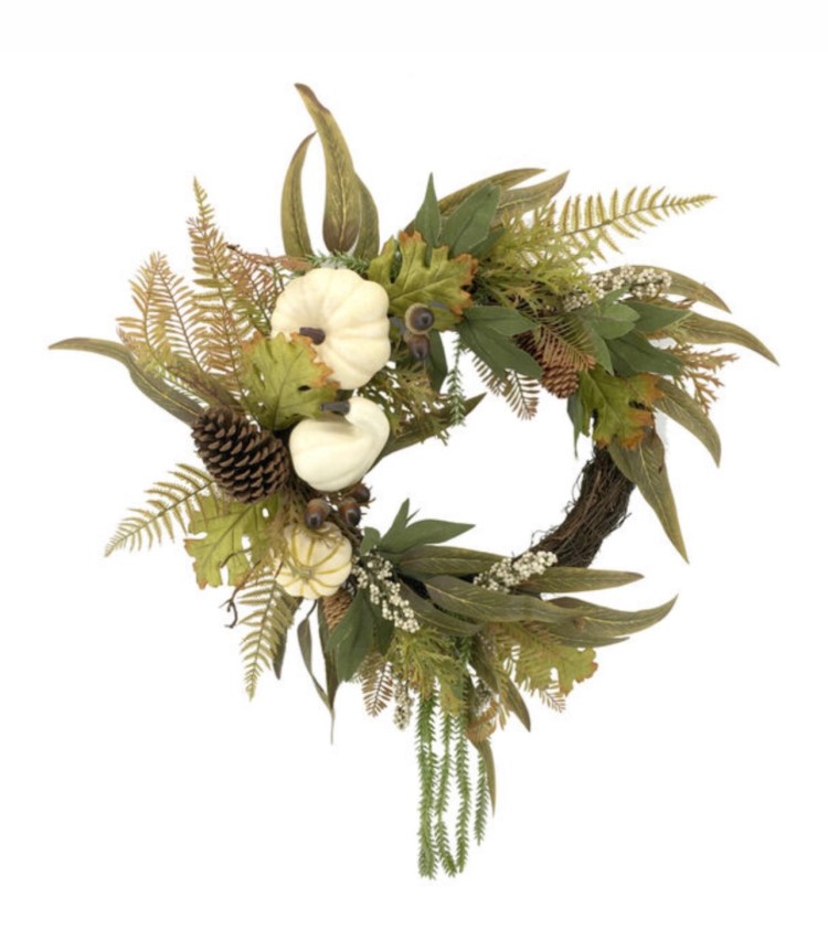 The Bloom Room Autumn Wreath is decorated with white pumpkins, gourds, pinecones & leaves. The wreath offers a subtle touch of Fall for your seasonal home decor.