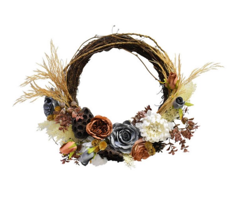 The Bloom Room Autumn Fall Harvest Wreath is decorated with rose, mum & wheat making it the perfect blend of rustic charm and beauty.