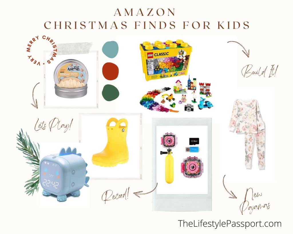 (1) Crazy Aaron’s Holiday Scented Thinking Puddy (2) LEGO Classic Large Brick Box (3) Crocs Kids’ Handle It Rain Boots (4) iMoway Waterproof Video Camera (5) Retro Rose Thermal Jammie Set (6) Kids Alarm Clock with Dinosaur