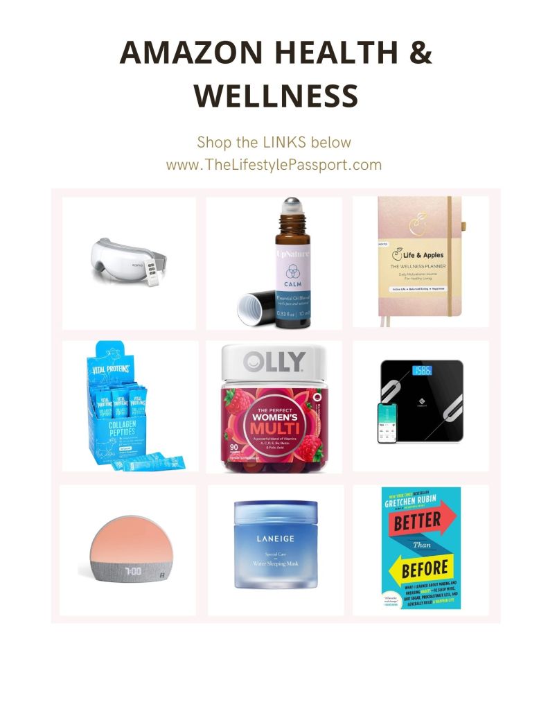 (1) Eye Massager (2) Stress Relief Essential Oil (3) Wellness Planner (4) Vital Proteins Collagen (5) Olly Multivitamin (6) Smart Digital Scale (7) Sound Machine (8) LANEIGE Sleeping Mask (9) Better Than Before