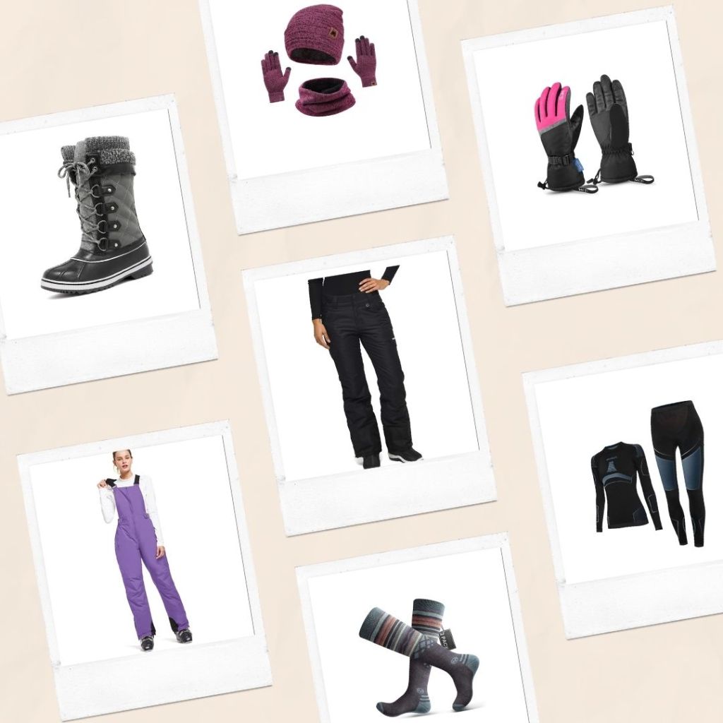 (1) Women’s Grey Waterproof Boot (2) Women’s Waterproof Ski Bib (3) Hat & Glove Set (4) Women’s Insulated Cargo Pant (5) Wool Ski Sock (6) Women’s Waterproof Snow Glove (7) Thermal Long Johns