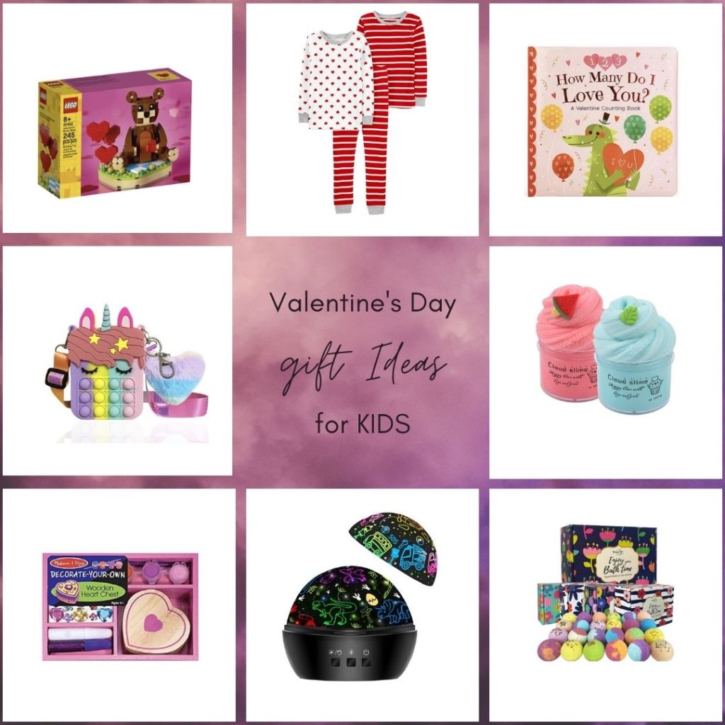 (1) Lego Valentine’s Bear (2) Carter’s PJ Set (3) Valentine Counting Book (4) Pop Fidget Purse (5) Slime Kit (6) Melissa & Doug Heart Box Craft (7) Dinosaur Light (8) Bath Bomb Set