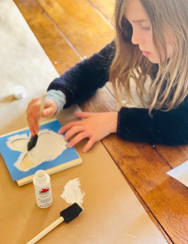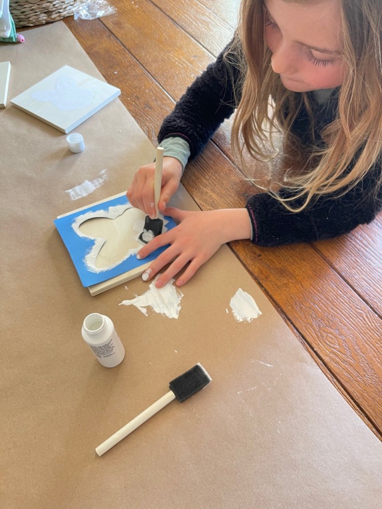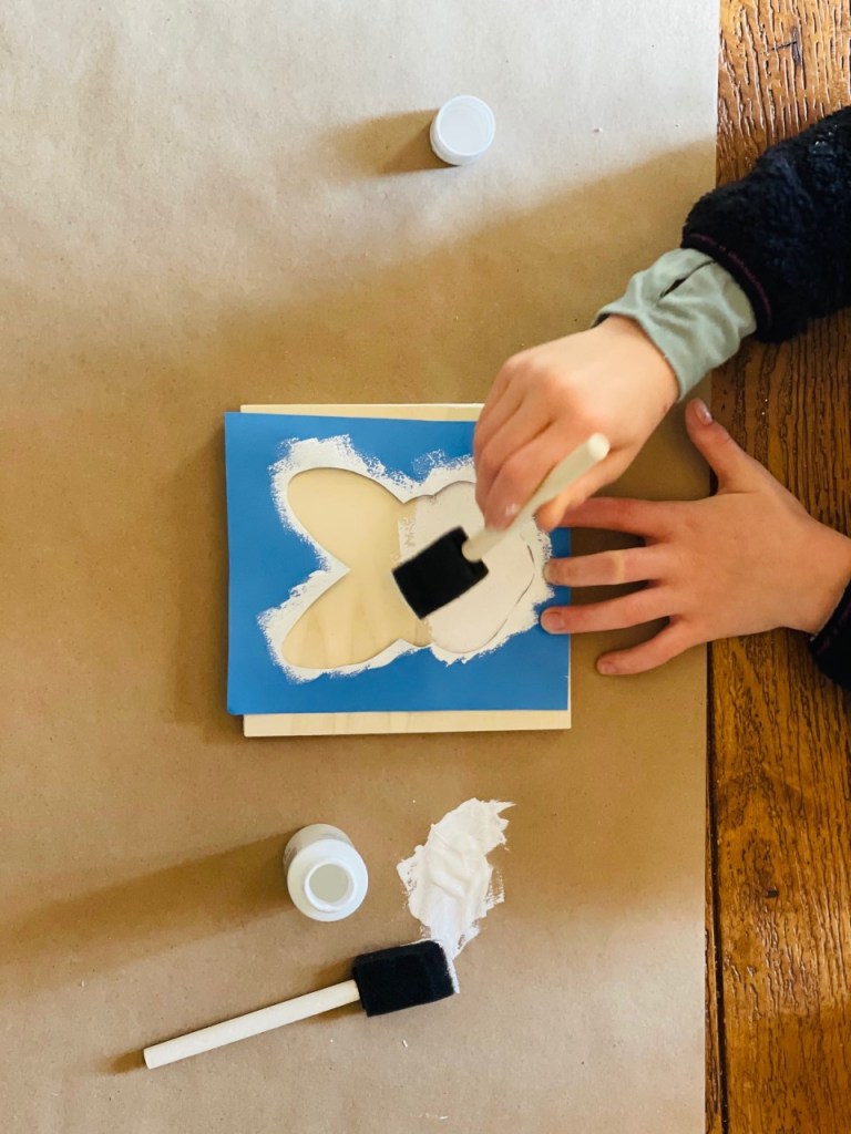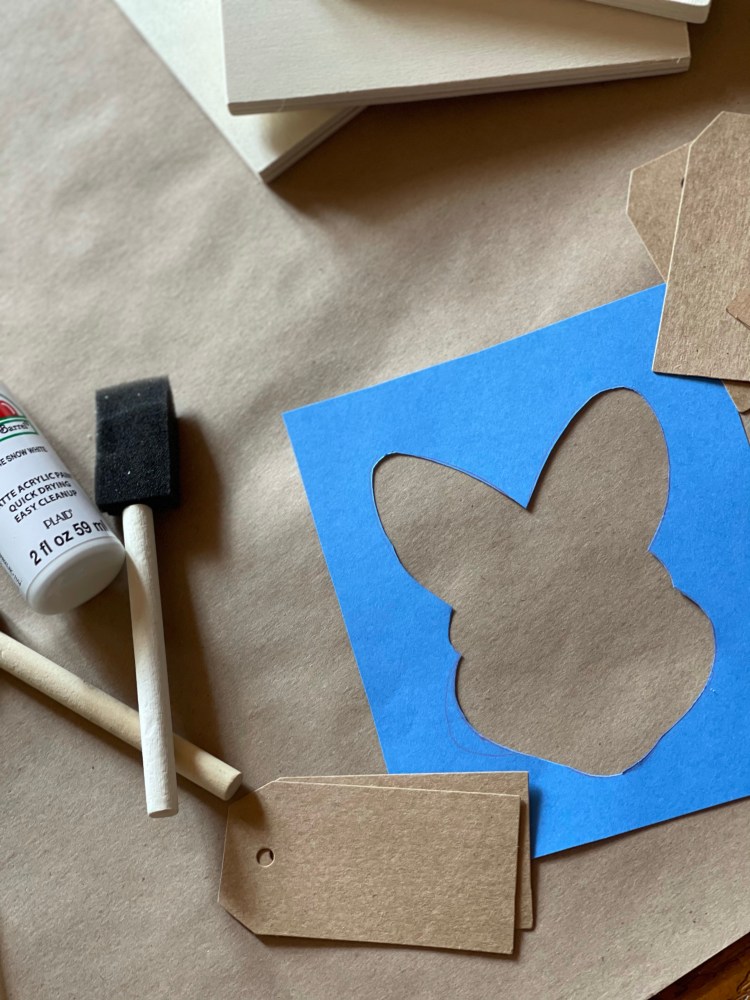 Directions – (1) Make a stencil using cardboard or construction paper. (I used a cookie cutter to draw our bunny stencil) (2) Place stencil over wooden square. (3) Dab small amount of paint on wooden board using stencil. (4) Allow to dry. (5) Done!