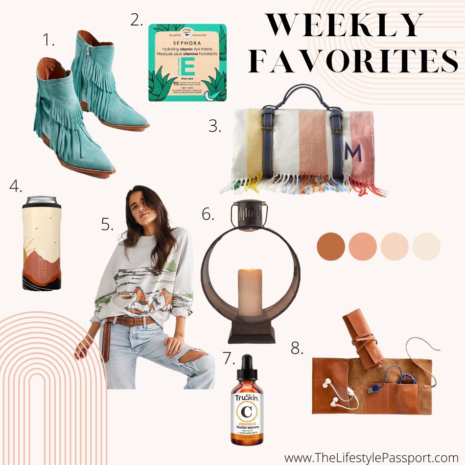 This week’s favorites feature products from some of my favorite retailers. The Lawless Fringe Western Boots from Free People come in several colors and pair perfectly with dresses – I’m obsessed! With all of my recent travels, I’m also loving this Leather Charger Roll Up and Waterproof Picnic Blanket from Mark and Graham. The TruSkin Vitamin C Serum has recently replaced by Skinceuticals Vitamin C Serum and it would be a crime if I didn’t tell you, I like TruSkin more!
