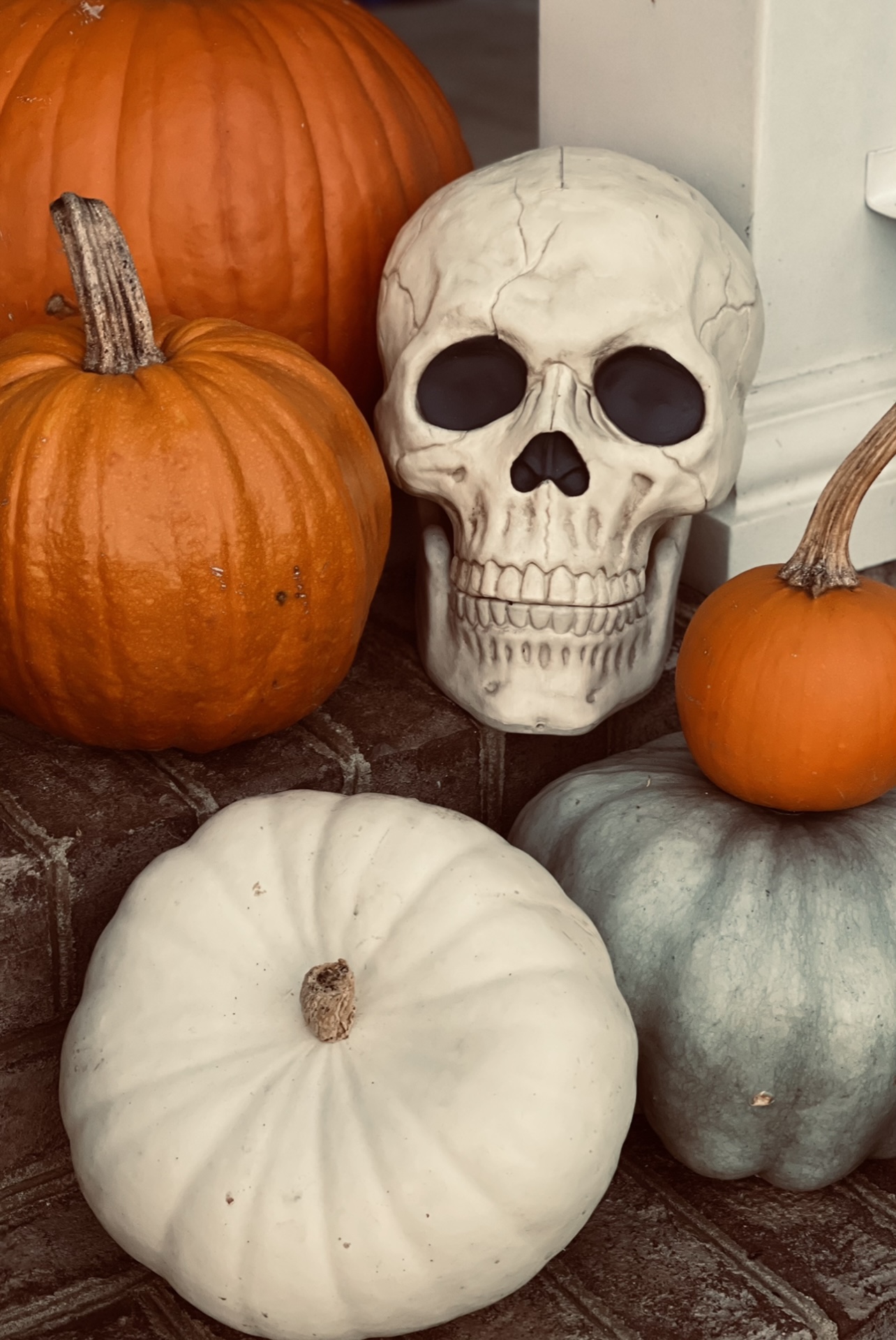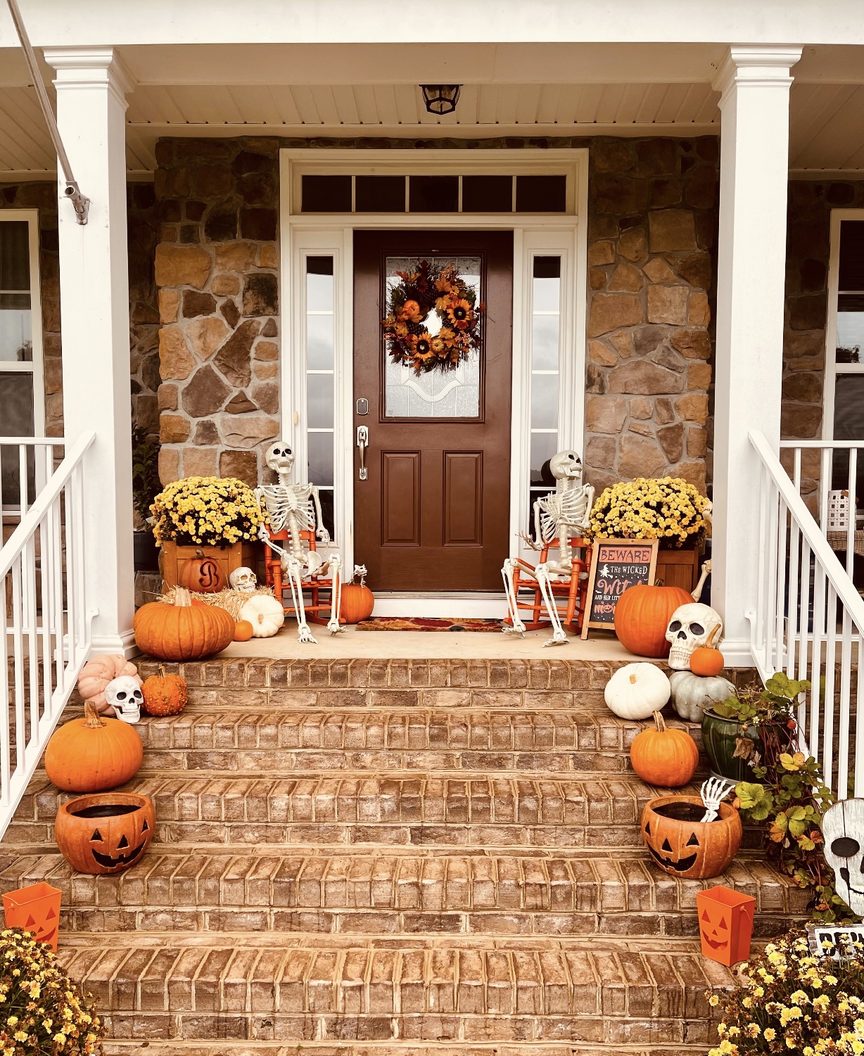 Last year I created a traditional fall-themed porch with lots of pumpkins, Mums, and bales of hay. As Halloween grew closer I was able to easily update the space with skeletons for the perfect amount of spooky! To give the porch display dimension, I used a pair of old wooden rocking chairs that I already owned. A quick coat of orange paint and they were the perfect addition. I replaced our summer flowers with large Mums on both sides of our front door to add a little symmetry. Small bales of hay are perfect adding height to any fall display. In my case, the bales of hay were great for my various pumpkins. Speaking of pumpkins, you can NEVER have too many, so feel free to load up on as many pumpkins as you can! If you are able, and you have a ton of pumpkins, a great way to use them is to decorate the stairs by trickling pumpkins of various sizes and colors down each step.