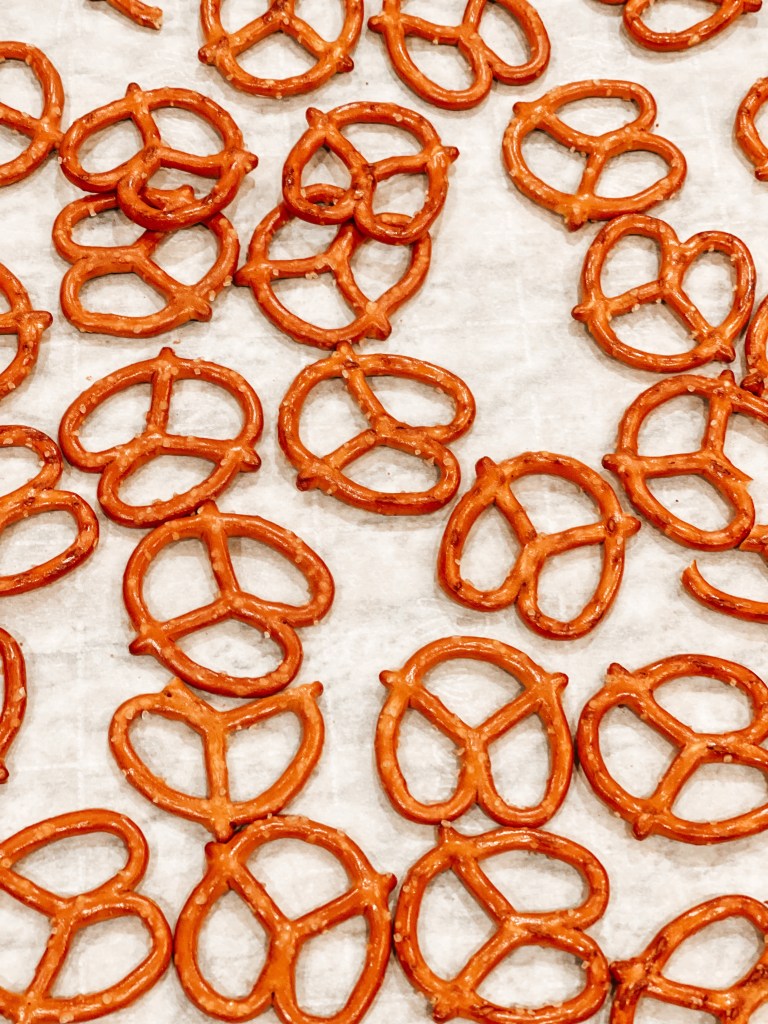 Step 2: Lay out pretzels on parchment paper to prepare for dipping. I use this opportunity to remove any broken pretzels.