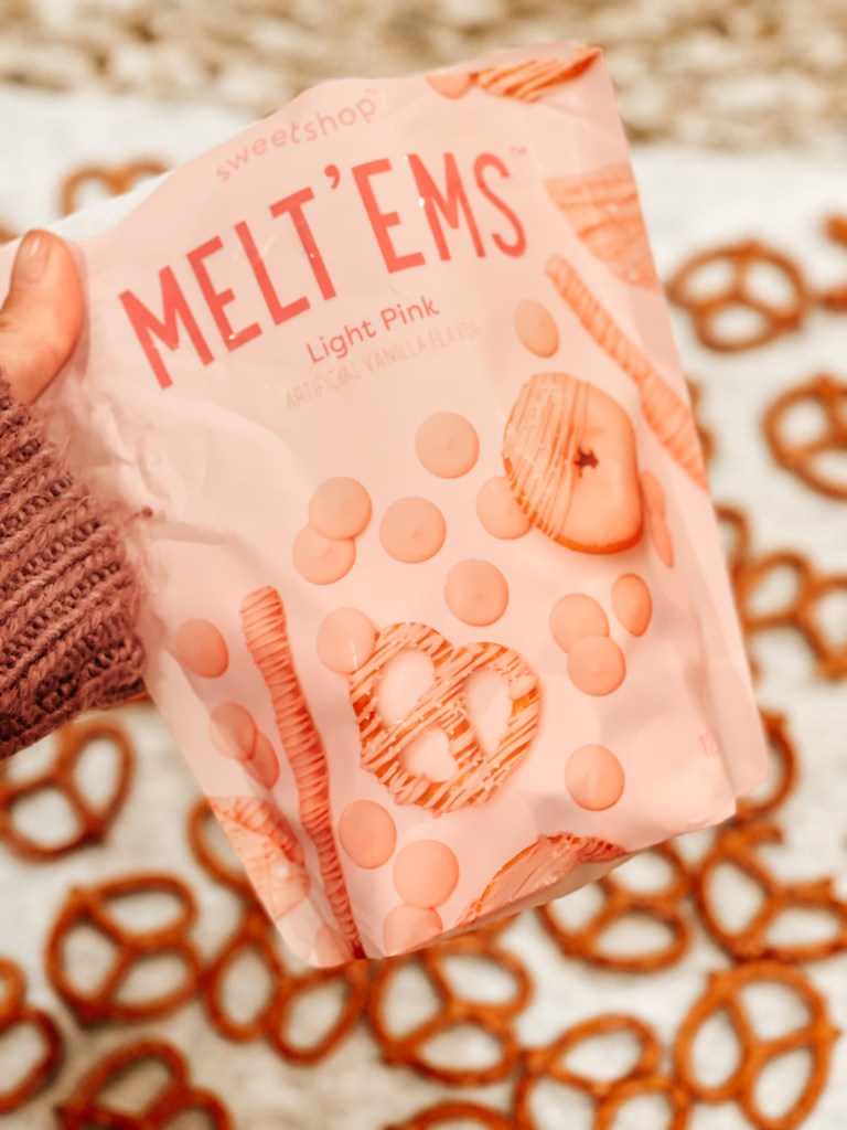 Step 5: After dipping or drizzling sauce on the pretzels, add candy topping of choice before candy sauce hardens.